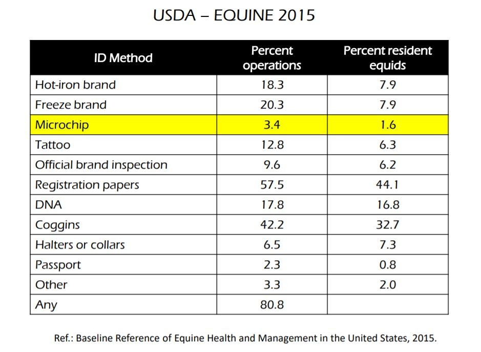 Only 3.4% of the operations had any horses with microchips. Of those facilities that had at least one horse microchipped, only 1.6% of their horses carried chips.
