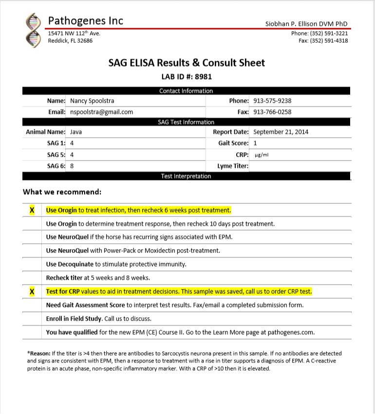 Dr. Ellison’s lab, Pathogenes, tests for 3 different variations (called serotypes) of S. neurona. A horse that tests negative has not been exposed to the protozoan parasite at all. They also have specific tests to look for autoimmune reactions that lead to chronic inflammation that targets the nervous system. The latter test is called CRP which stands for C-Reactive Protein. CRP is a nonspecific marker of inflammation. Different types of “insult” to the body result in different types of cells responding to that insult. Therefore, an elevated CRP doesn’t tell you what type of cell is responding, only that there is inflammation going on.