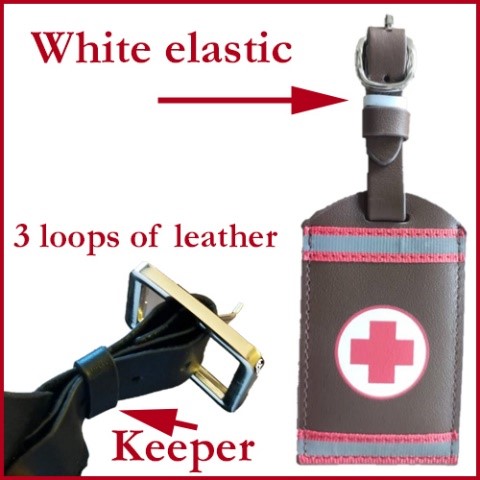 Throughout these instructions, we will emphasize that there are three passes of the leather strap through the keeper, which is the leather loop that holds the three straps of leather together. On our NEW tags, a white elastic band is included, which fits snuggly under the keeper.