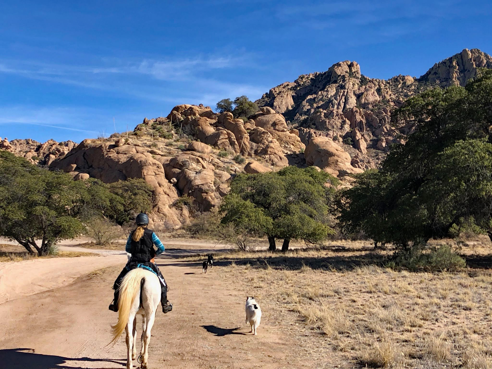 If the trails are very active, and we are likely to encounter many riders, we don’t take the dogs. However, if we do encounter other riders, we pull off the trail. Our dogs readily come when called, and they lie down, well off the trail. They don’t move when other riders go by. In fact, they alert us when they see oncoming traffic. They return to us before they are called and they know exactly what they are supposed to do. This same “rule” applies when I am hiking with them.