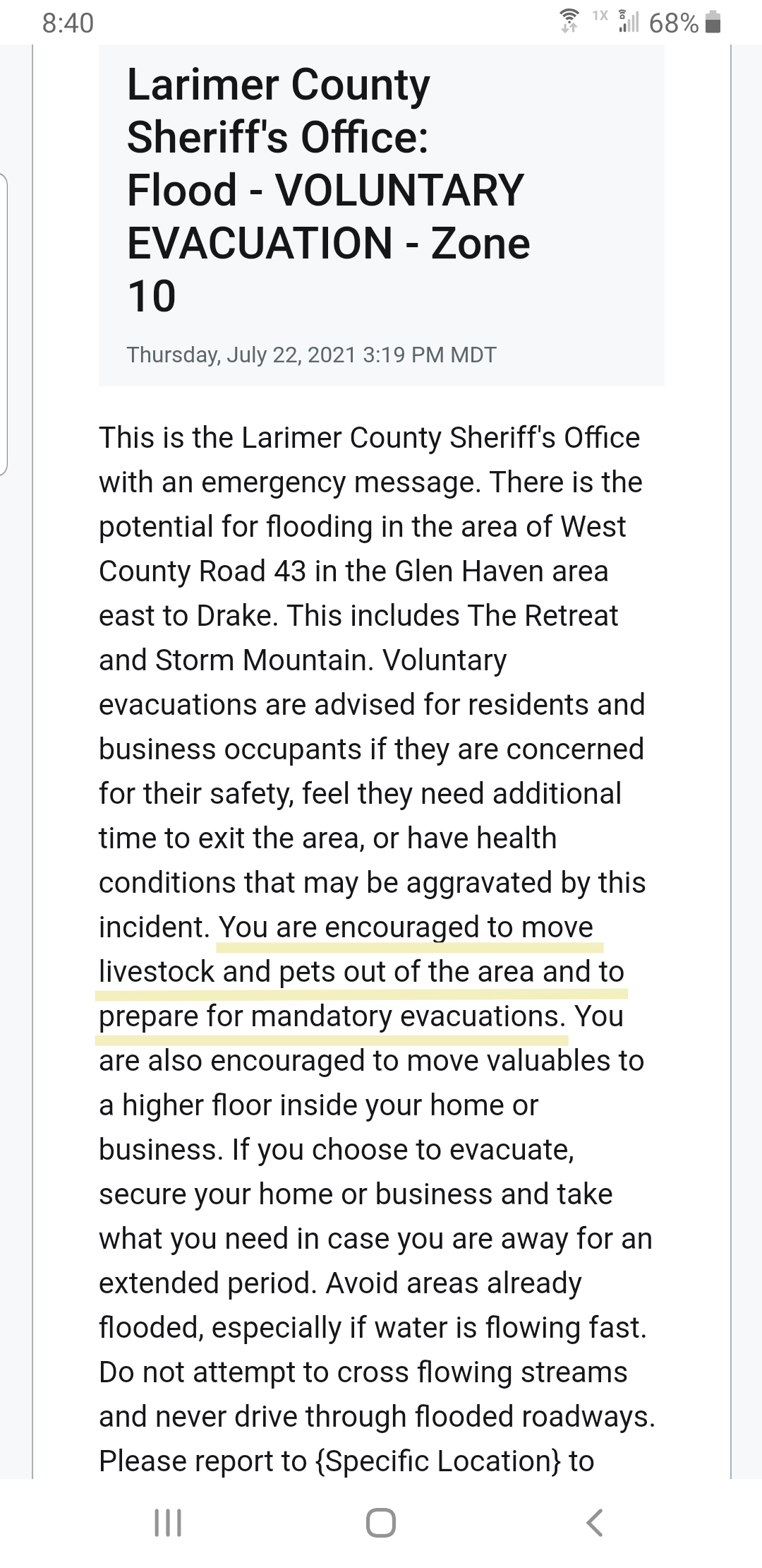 Most folks who have read my blogs before know that I am the creator of a safety product for horses and riders. Our horses wear identification tags, so if some horrible catastrophe occurs in a matter of seconds, Alan and I are not scrambling to make sure our livestock is identified. Yes, I have a vested interest in spreading the word about the existence of this new product. But folks, I am not making up the need for it. Just like you, I was minding my own business, watching the news, when I heard the NBC segment. I was going about my daily life when I got the voluntary evacuation text because of flooding occurring after the wildfire. We have homes in two states, and both of them have been threatened by wildfires and/or flooding.