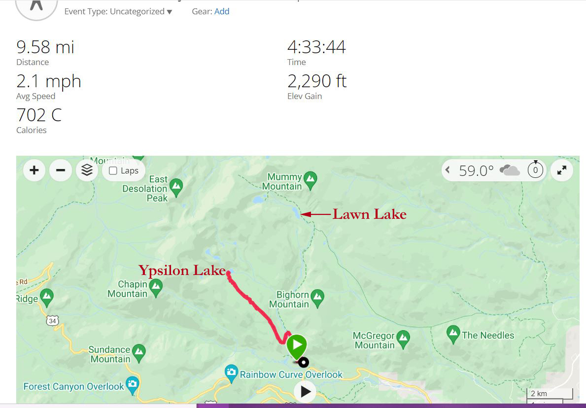 If you follow the hotlink to more information about the Alluvial Fan, you will learn that it is a result of the failure of an earthen dam that contained Lawn Lake. Lawn Lake is north and east of Ypsilon Lake. Both Lawn and Ypsilon Lake Trails are horse-friendly. Lawn Lake Trail is 13 miles out-and-back, while Ypsilon is listed at a hair less than 9. The additional mileage reflected in my Garmin recording below allows for the quarter-mile trek to the stock parking area. As you can see, I am not kidding when I say it is up, up, and up!